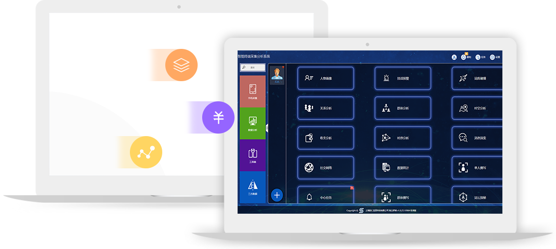 在数据分析方面产品有极大的优势,不仅在单个手机的【分析维度】、【纵深】、【关联性】方面极其细致、详尽;而且针对多个智能手机,提供各种维度的群体类、组织类分析,便于【挖掘群体特性】的通联、行程、经济、内容等特征。